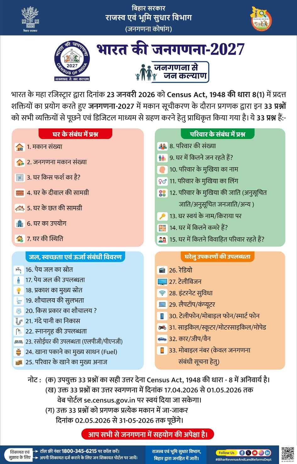 नोट: जनगणना अधिनियम, 1948 की धारा 8 (1) के अंतर्गत 02 मई 2026 से 31 मई 2026 तक सभी से निम्नलिखित 33 प्रश्नों का जवाब मांगा जाएगा।