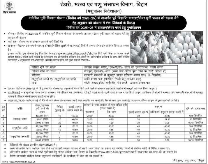 Bihar Murgi Farm Yojana 2026 – कोटि, क्षमता, ,रिक्त इकाई, इकाई लागत लाख रुपये में