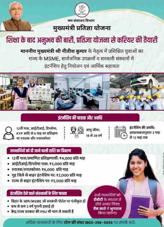 साथ ही मुख्यमंत्री प्रतिज्ञा योजना क्या है कैसे लाभ ले इसकी की पूरी जानकारी जान सकते हैं। मुख्यमंत्री प्रतिज्ञा योजना अंतर्गत देश के माने जाने कंपनियों में इंटर्नशिप के तहत कार्य करने की हुनर सिखाई जाएगी जिसके तहत बिहार सरकार की ओर से युवाओं को हर माह ₹4000 से ₹6000 की इंटर्नशिप दी जाएगी।