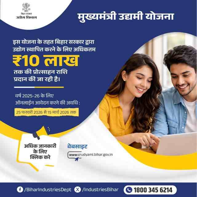 बिहार सरकार उद्योग विभाग द्वारा बिहार में रोजगार या व्यवसाय करने के लिए बिहार उद्यमी योजना के तहत 10 लाख रुपए की राशि दी जाती। इस योजना का लाभ लेने के लिए प्रतिवर्ष निर्धारित समय पर ऑनलाइन आवेदन प्रक्रिया शुरू किया जाता है। इस वर्ष भी 25 फरवरी 2026 का ऑनलाइन आवेदन प्रक्रिया शुरू कर दिया गया है।